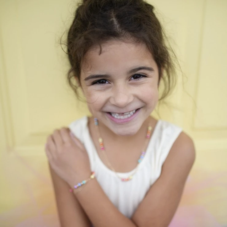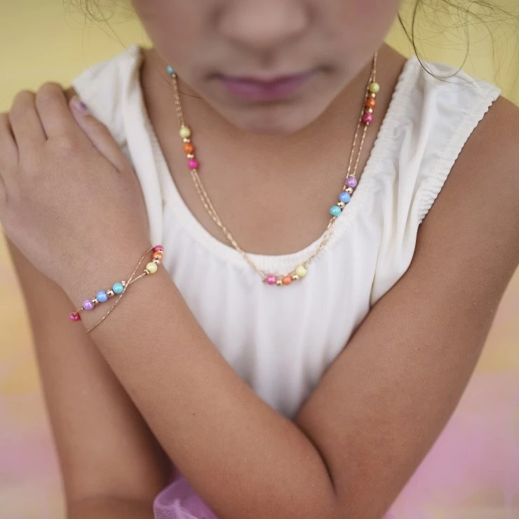 Une combinaison unique de chaînes dorées délicates et de perles arc-en-ciel nacrées et métalliques rend notre bracelet aussi élégant qu’amusant.