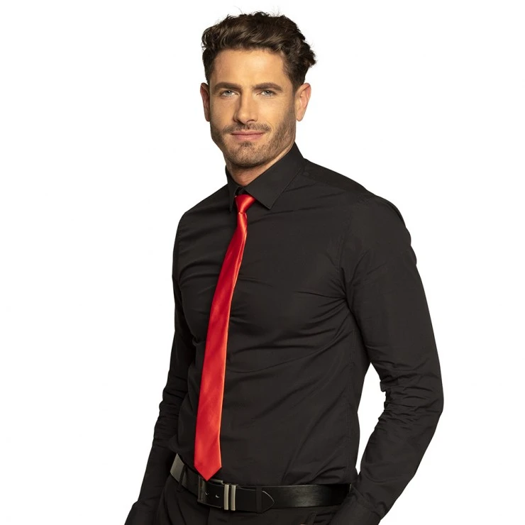 Cette cravate rouge se maintient facilement sans nœud grâce à son bandeau élastique.