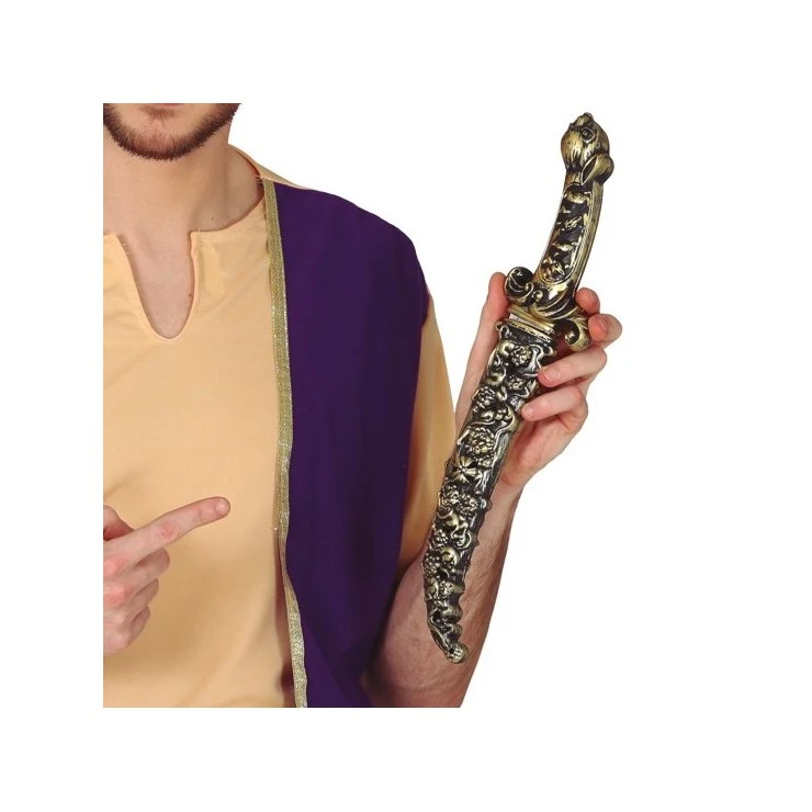 Cette fausse dague en plastique d’aspect cuivré est livrée avec son fourreau assorti.