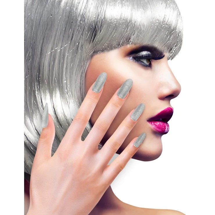 Set de 12 faux ongles argentés iridescent avec adhésifs.