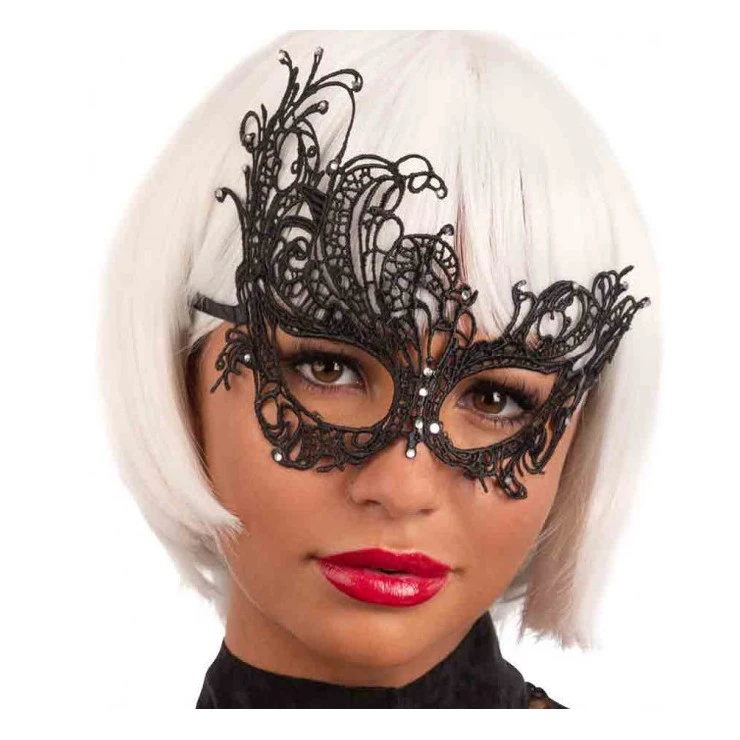 Ce loup en dentelle de tissu macramé noir est décoré de strass.