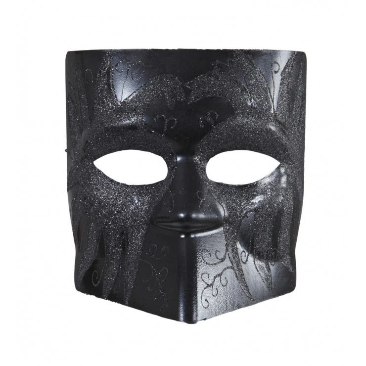 Ce masque noir en plastique est décoré de motifs baroques pailletés.