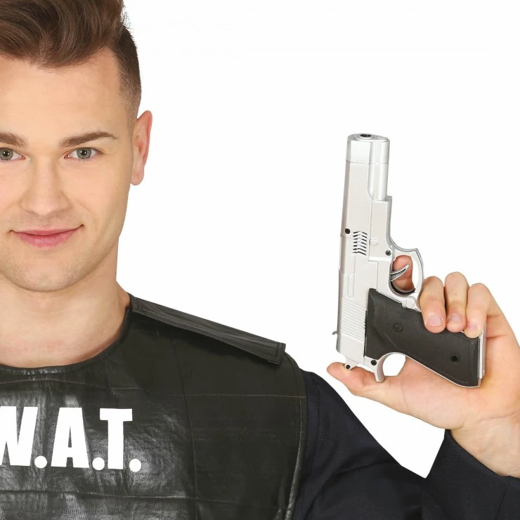 Ce faux pistolet sera parfait pour compléter un déguisement policier ou de bandit.