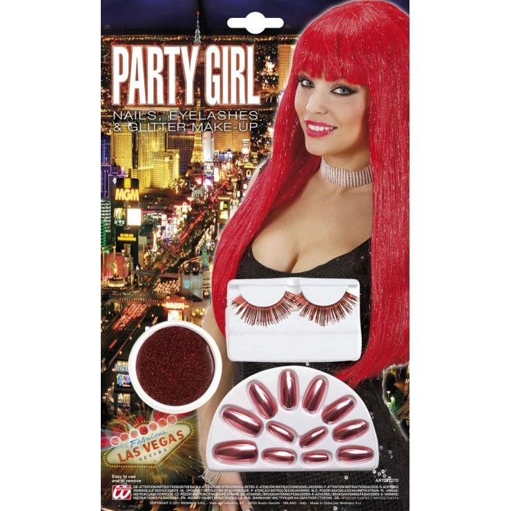 Ce kit pour femme comprend une paire de faux cils, des faux ongles et du maquillage rouge.